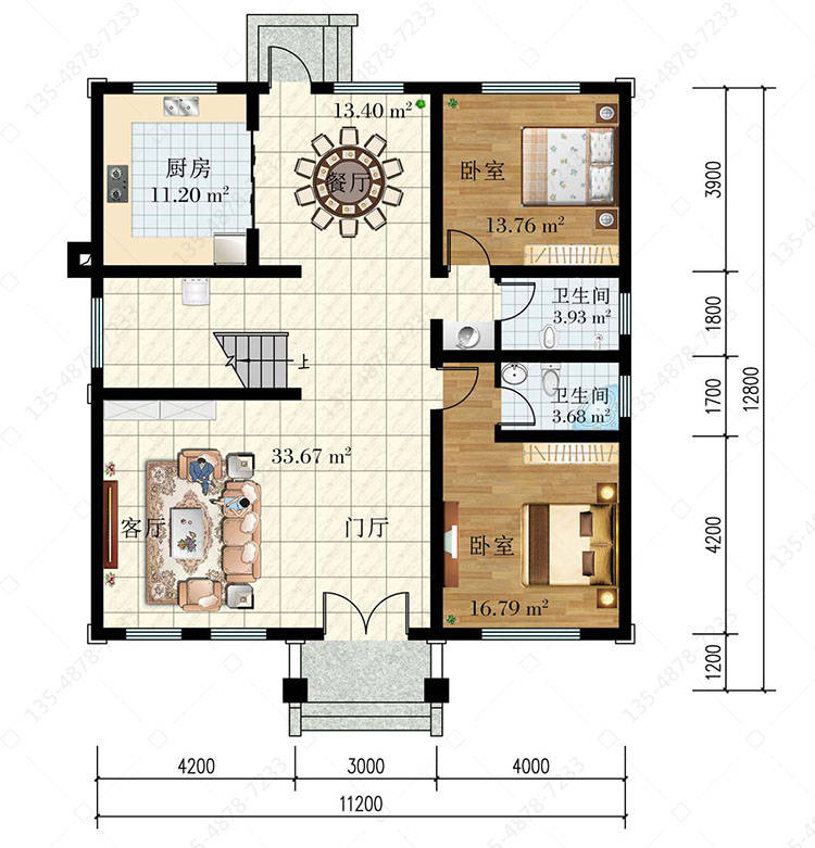 一 层:门厅、客厅、卧室(附卫生间)、卧室、厨房、餐厅、卫生间