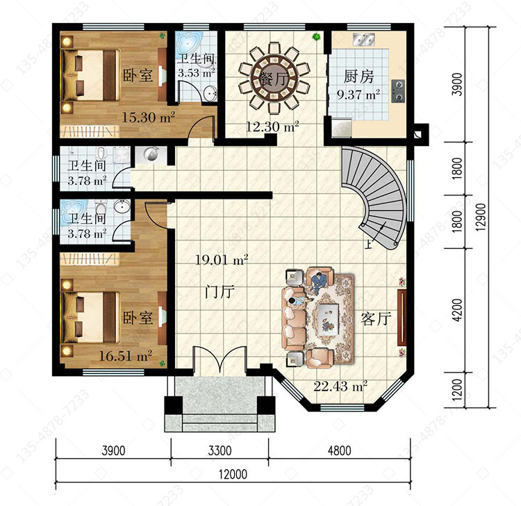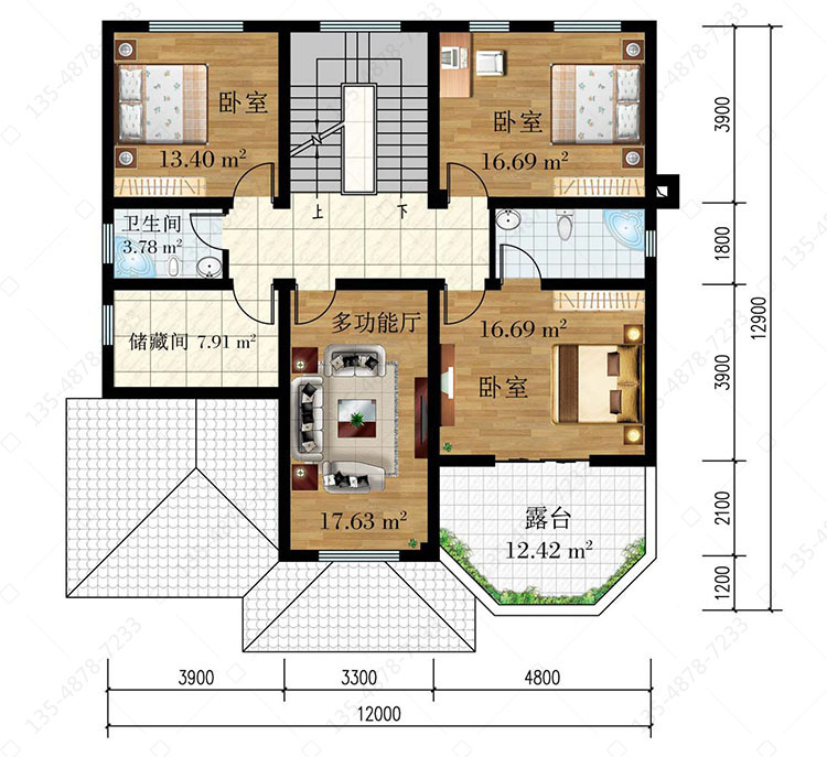 三 层:多功能厅、卧室(附卫生间、露台)、2卧室、储藏间、卫生间