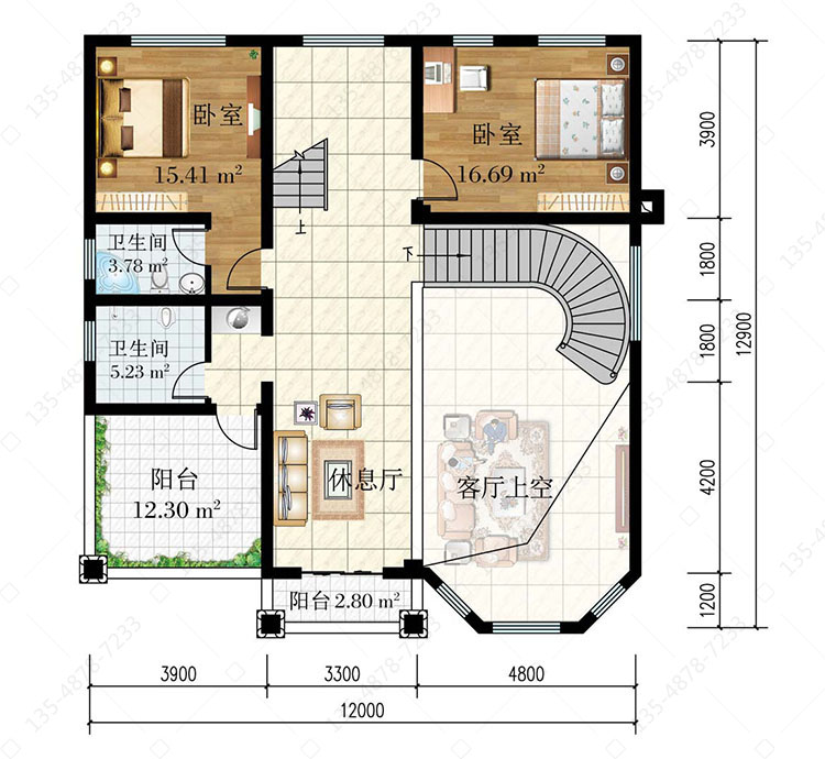 二 层:休息厅、卧室(附卫生间)、卧室、卫生间、2阳台