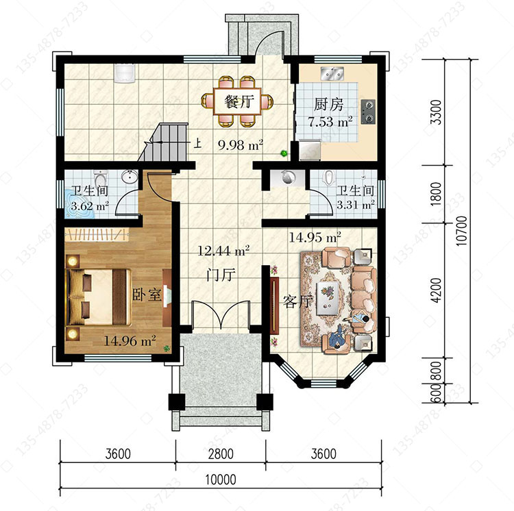 一 层:门厅、客厅、卧室(附卫生间)、厨房、餐厅、卫生间