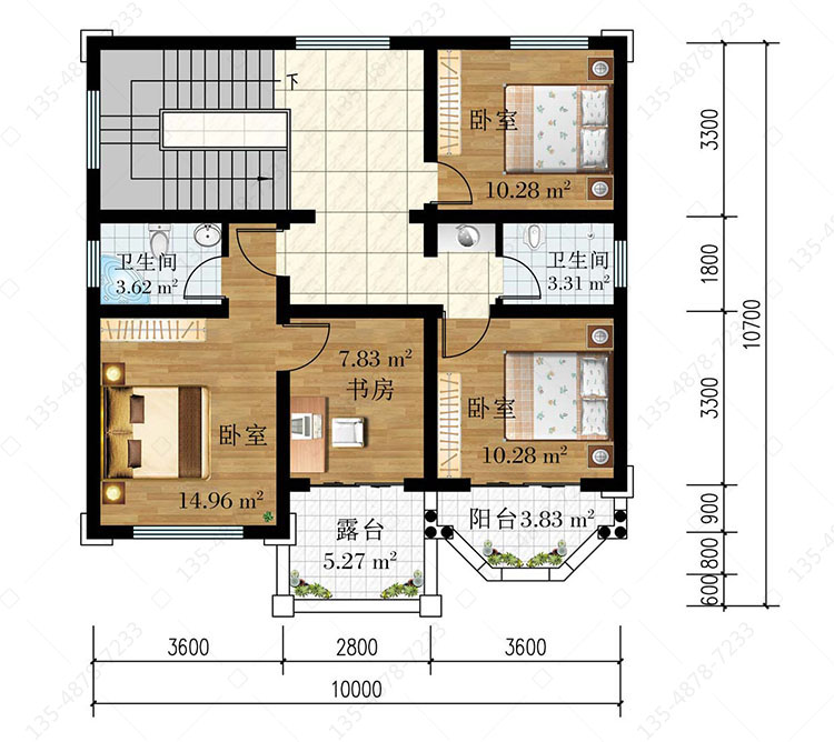 三 层:卧室(附卫生间、书房、露台)、卧室(附阳台)、卧室、卫生间