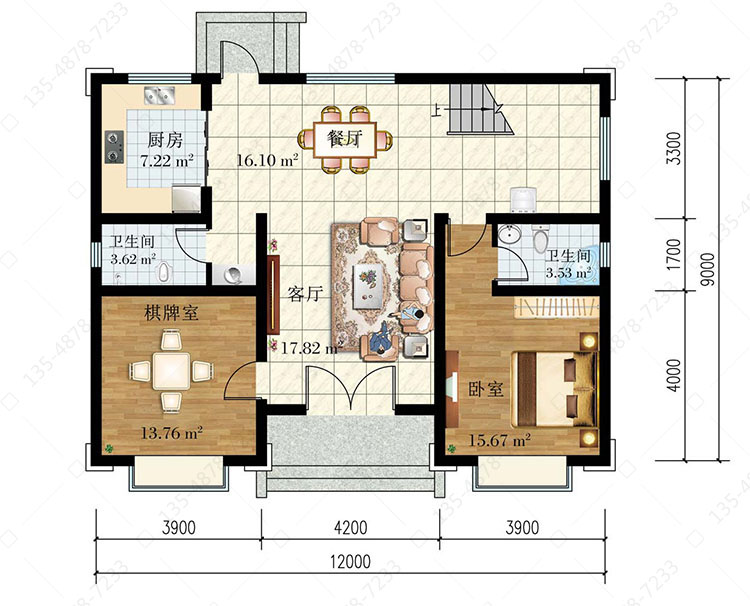 一 层:客厅、卧室(附卫生间)、棋牌室、厨房、餐厅、卫生间