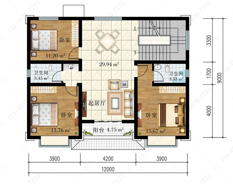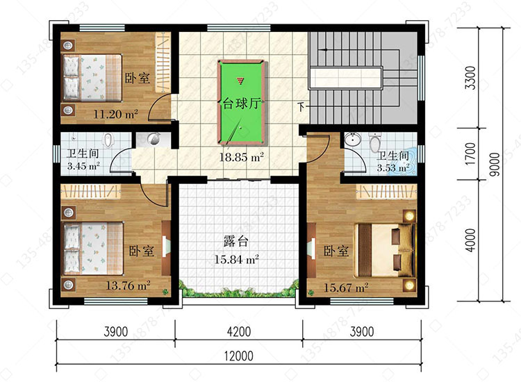 三 层:台球厅、卧室(附卫生间)、2卧室、卫生间、露台
