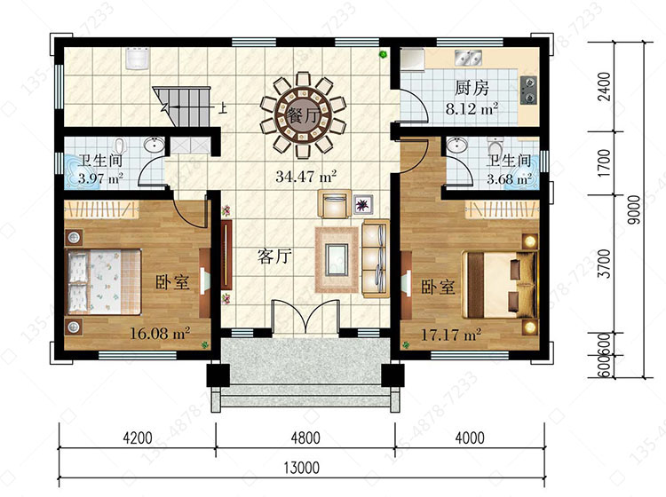 一 层:客厅、卧室(附卫生间)、卧室、厨房、餐厅、卫生间