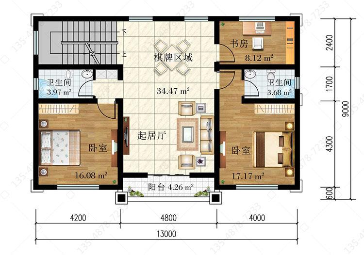 二 层:起居厅、棋牌区域、卧室(附卫生间)、卧室、书房、卫生间、阳台