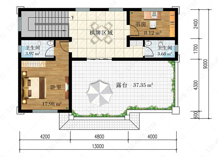 三 层:棋牌区域、卧室(附卫生间)、书房、卫生间、露台