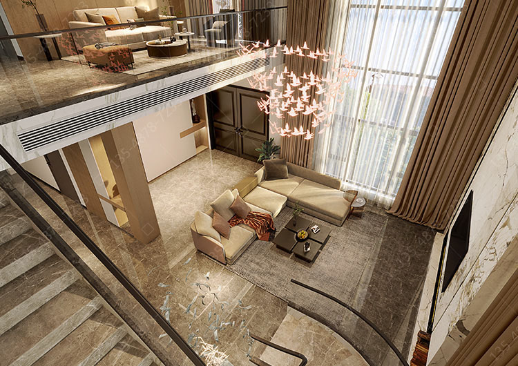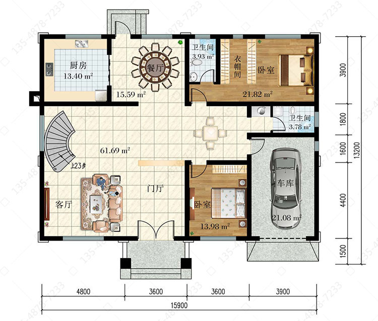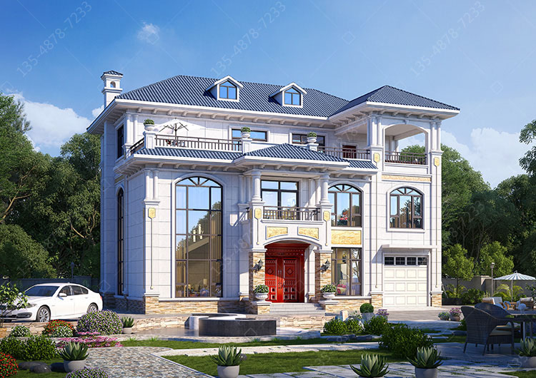 一 层:门厅、客厅(中空)、卧室(附卫生间、衣帽间)、卧室、厨房、餐厅、卫生间、车库
