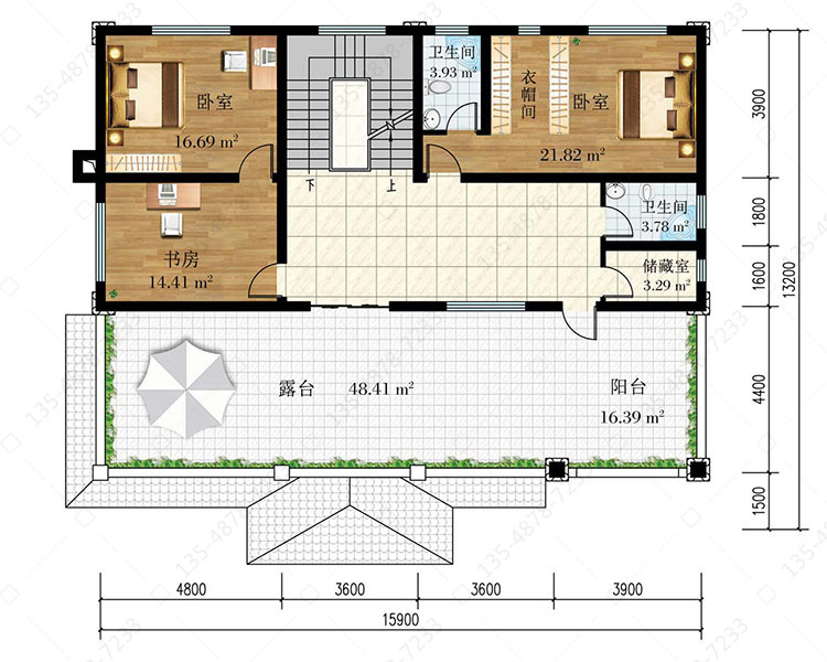 三 层:卧室(附卫生间、衣帽间)、卧室(附书房)、储藏室、卫生间、阳台、露台