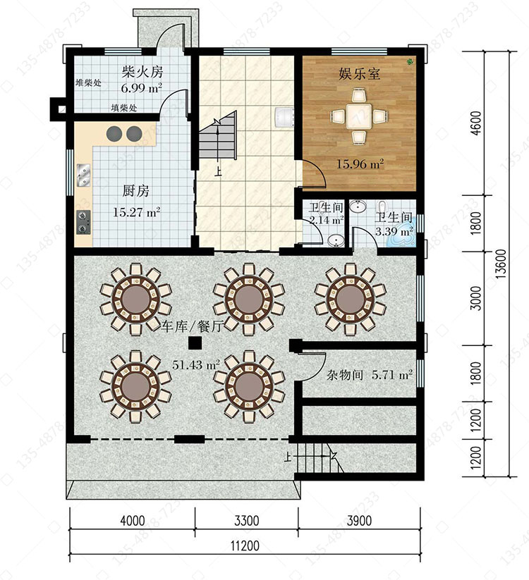 一 层:车库/餐厅、杂物间、娱乐室、厨房、柴火房、2卫生间