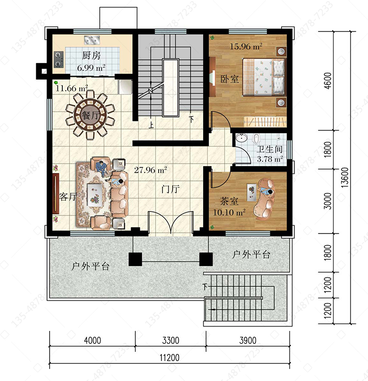 二 层:门厅、客厅、卧室、茶室、厨房、餐厅、卫生间、户外平台