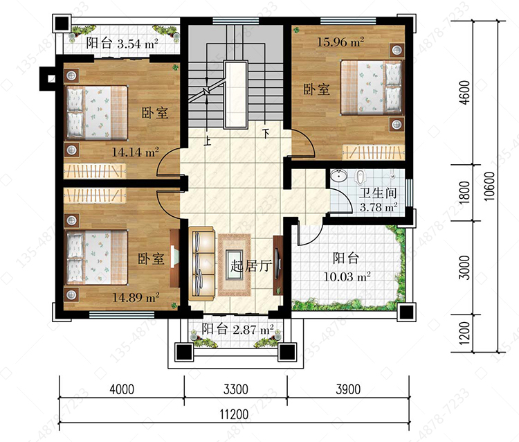 三 层:起居厅、卧室(附阳台)、2卧室、卫生间、2阳台