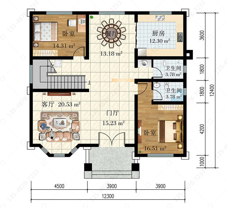 一 层:门厅、客厅(中空)、卧室(附卫生间)、卧室、厨房、餐厅、卫生间