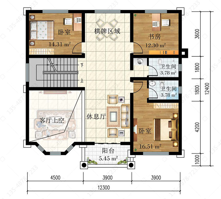 二 层:休息厅、棋牌区域、卧室(附卫生间)、卧室、书房、卫生间、阳台