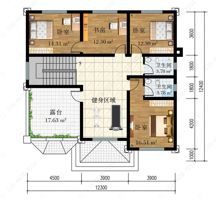 三 层:健身区域、卧室(附卫生间)、卧室(附书房)、卧室、卫生间、露台