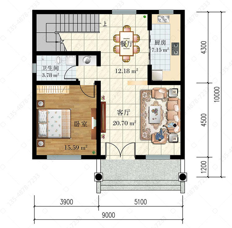 一 层:客厅、卧室、厨房、餐厅、卫生间