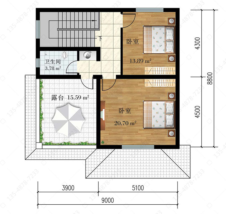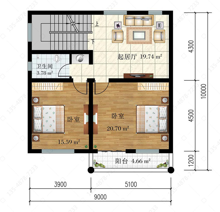 二 层:起居厅、卧室(附阳台)、卧室、阳台