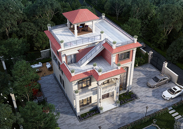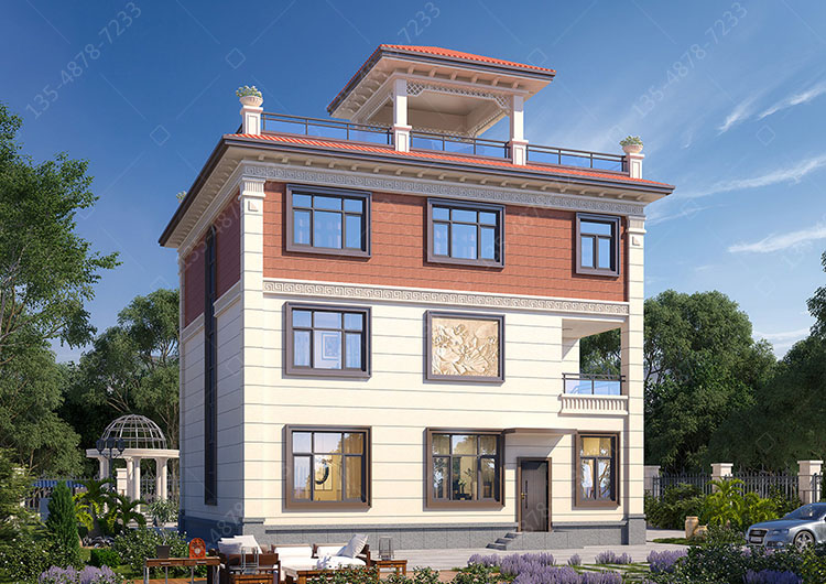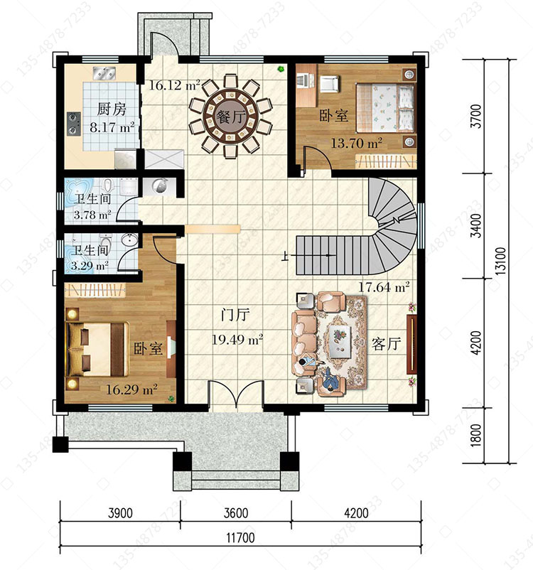 一 层:门厅、客厅(中空)、卧室(附卫生间)、卧室、厨房、餐厅、卫生间