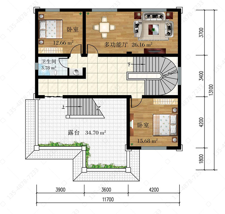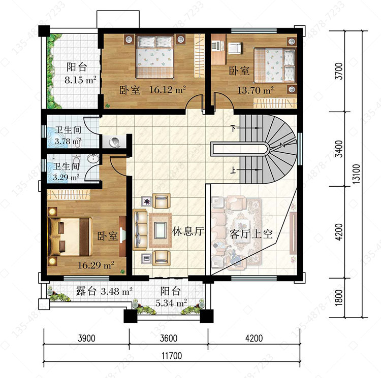二 层:休息厅、卧室(附卫生间)、卧室(附阳台)、卧室、书房、卫生间、阳台、露台