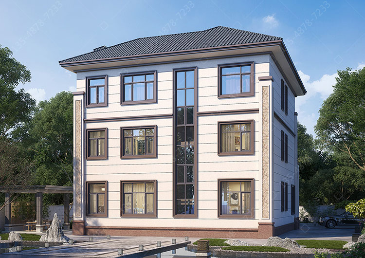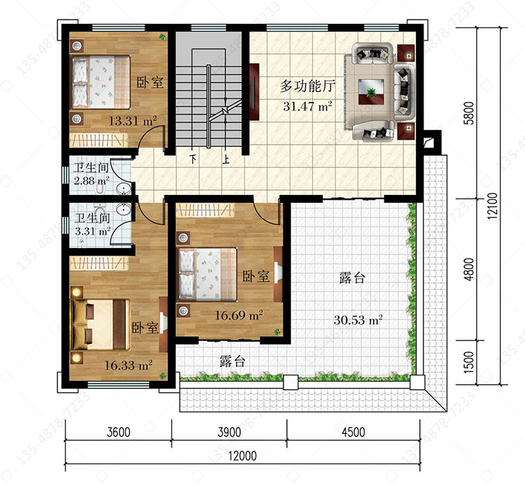 三 层:多功能厅、卧室(附卫生间)、卧室(附露台)、卧室、卫生间、露台