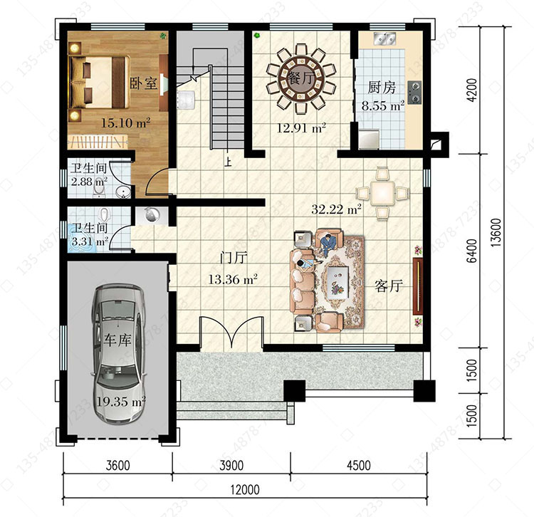 一 层:门厅、客厅、卧室(附卫生间)、厨房、餐厅、卫生间、车库