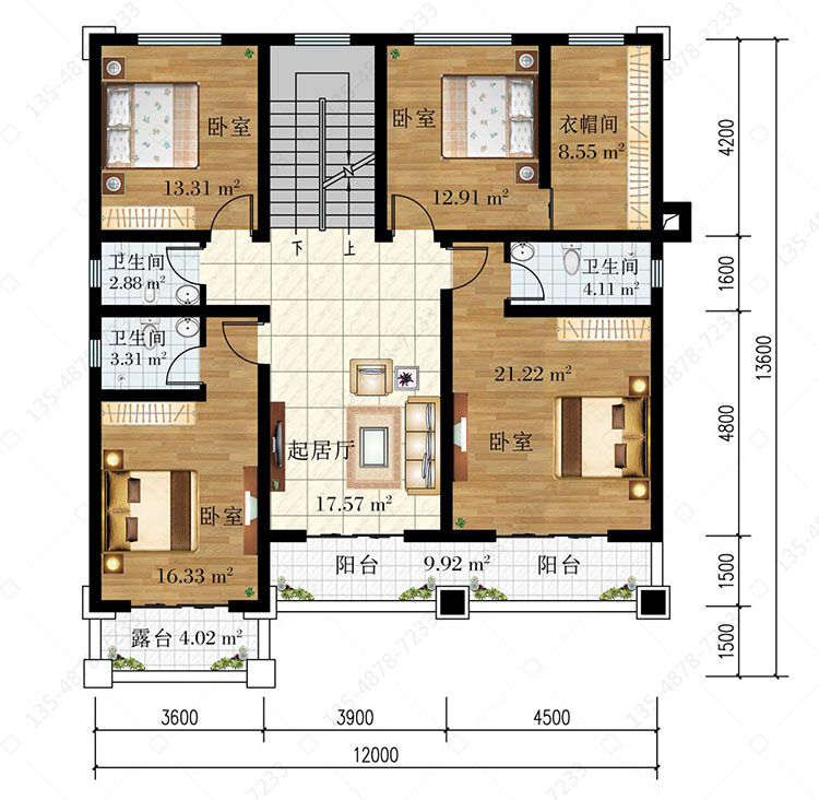二 层:起居厅、卧室(附卫生间、阳台)、卧室(附卫生间、露台)、卧室(附衣帽间)、卧室、卫生间、阳台