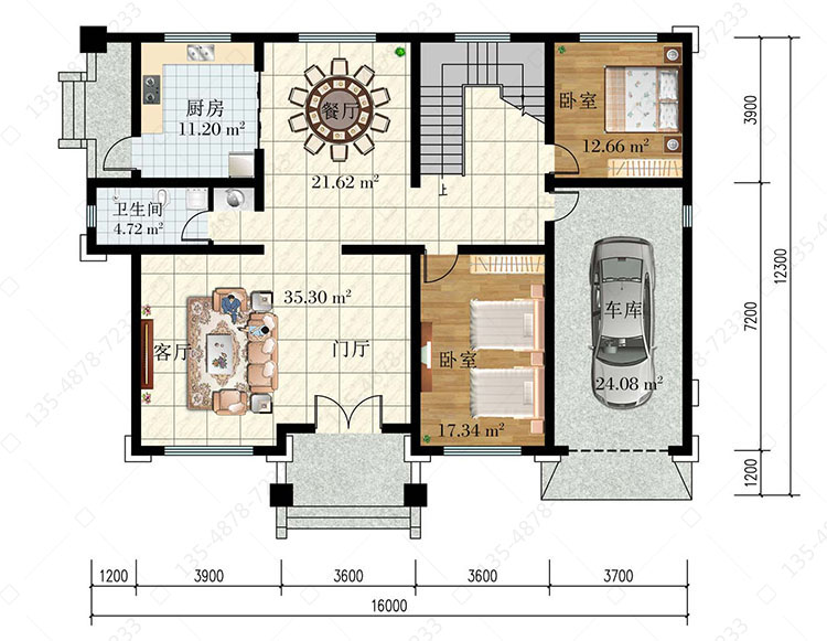 一 层:门厅、客厅、2卧室、厨房、餐厅、卫生间、车库