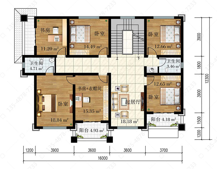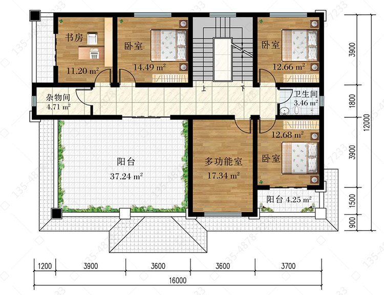 三 层:卧室(附阳台)、2卧室、书房、多功能室、杂物间、卫生间、阳台