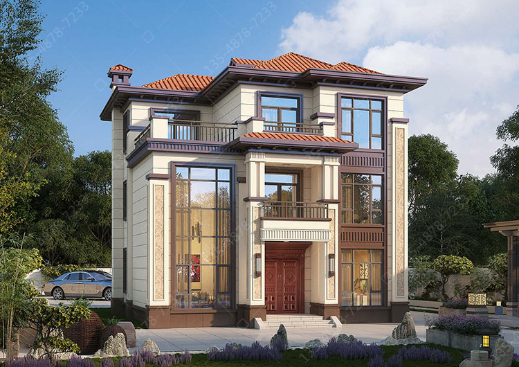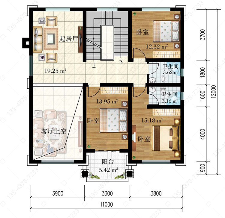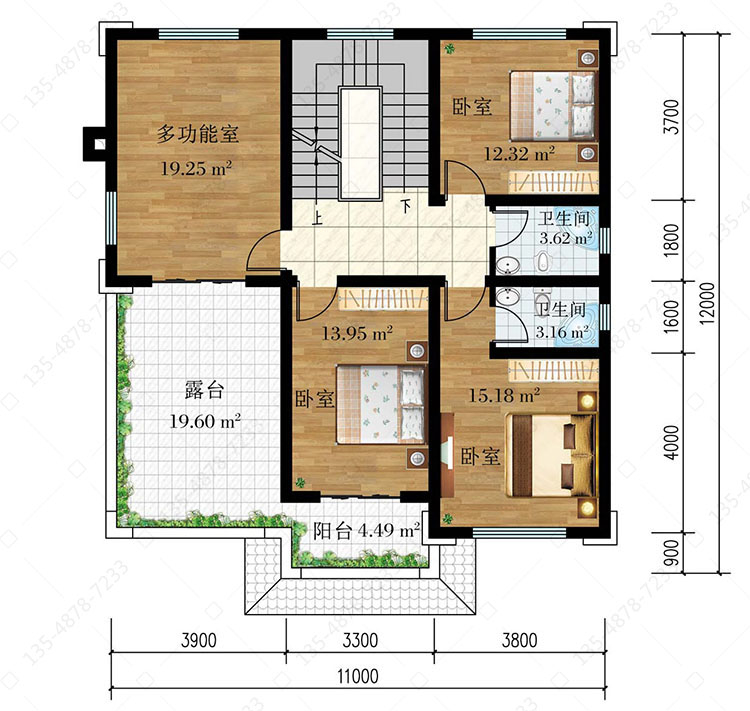 三 层:卧室(附卫生间)、卧室(附阳台)、多功能室(附露台)、卧室、卫生间