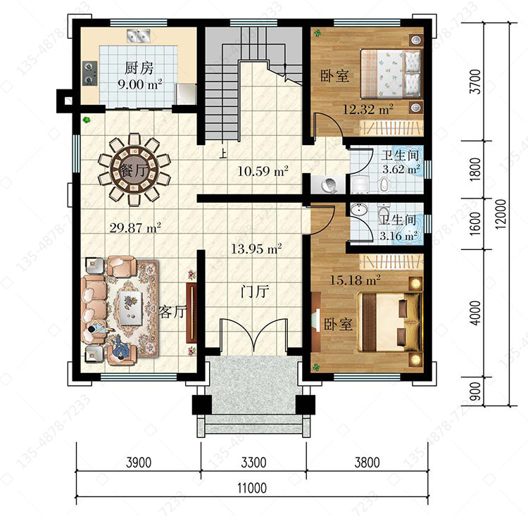 一 层:门厅、客厅(中空)、卧室(附卫生间)、卧室、厨房、餐厅、卫生间