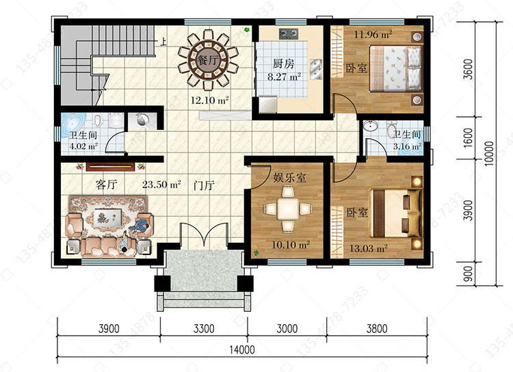 一 层:门厅、客厅、卧室(附卫生间)、卧室、娱乐室、厨房、餐厅、卫生间