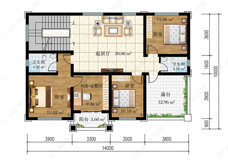 二 层:起居厅、卧(附卫生间、书房/衣帽间、阳台)、2卧室、卫生间、露台