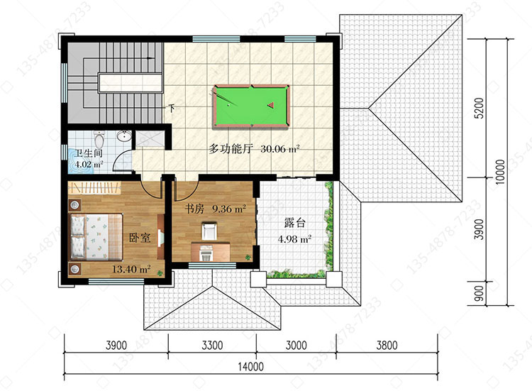 三 层:多功能厅、卧室、书房(附露台)卫生间