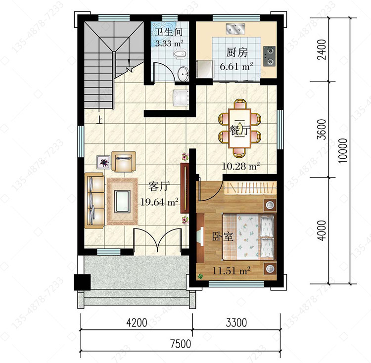 一 层:客厅、卧室、厨房、餐厅、卫生间