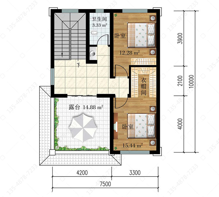 三 层:卧室(附衣帽间)、卧室、卫生间、露台
