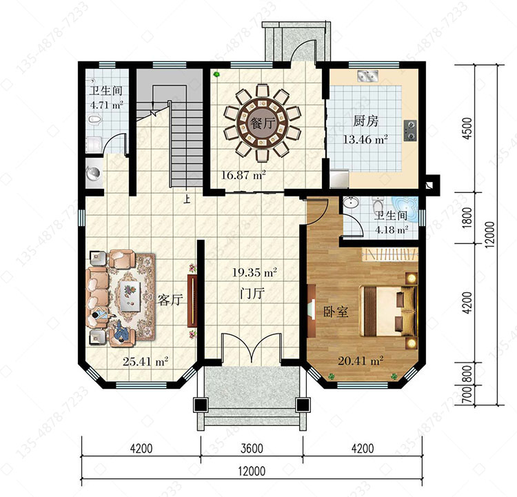 一 层:门厅、客厅、卧室(附卫生间)、厨房、餐厅、卫生间