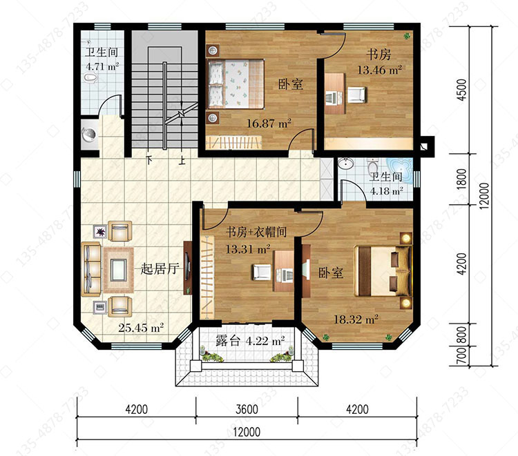 三 层:3卧室、杂物间、卫生间、2露台