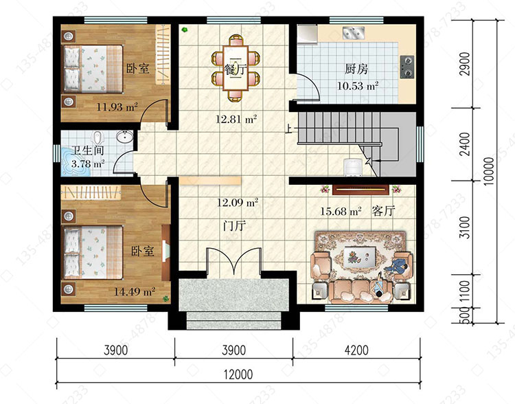 一 层:门厅、客厅、2卧室、厨房、餐厅、卫生间