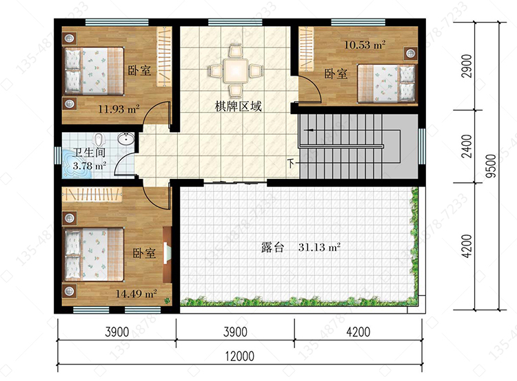 二 层:休闲厅、3卧室、书房、卫生间、阳台