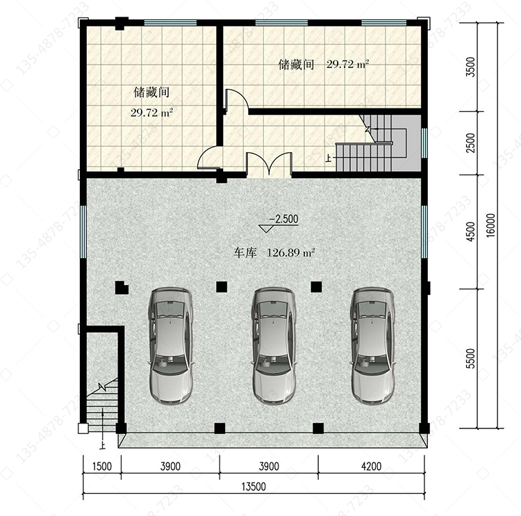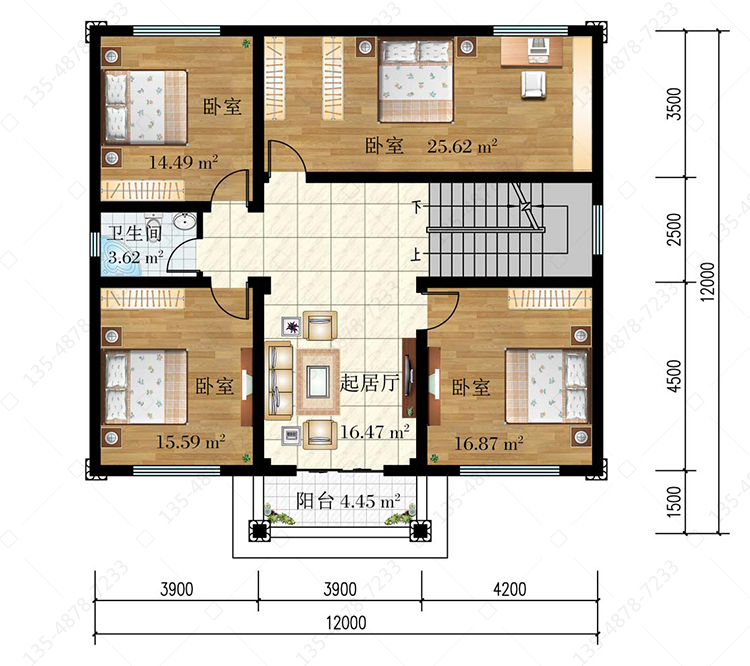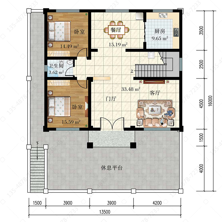 一 层:休息平台、门厅、客厅、2卧室、厨房、餐厅、卫生间
