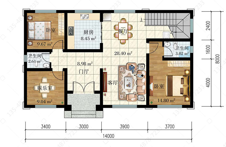 一 层:门厅、客厅、卧室(附卫生间)、卧室、娱乐室、厨房、餐厅、卫生间