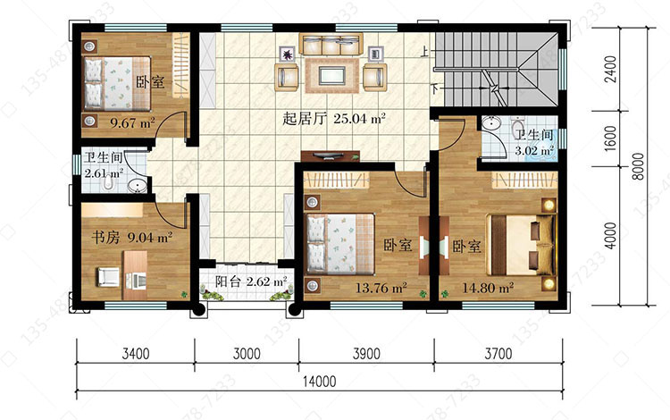 二 层:起居厅、卧室(附卫生间)、2卧室、书房、卫生间、阳台
