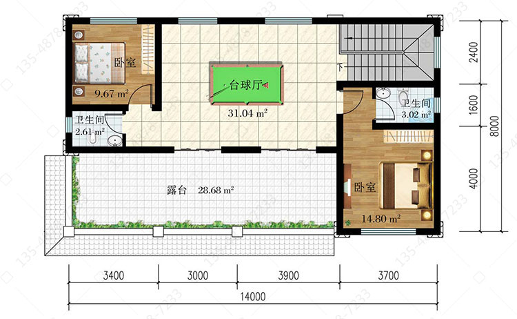 三 层:台球厅、卧室(附卫生间)、卧室、卫生间、露台