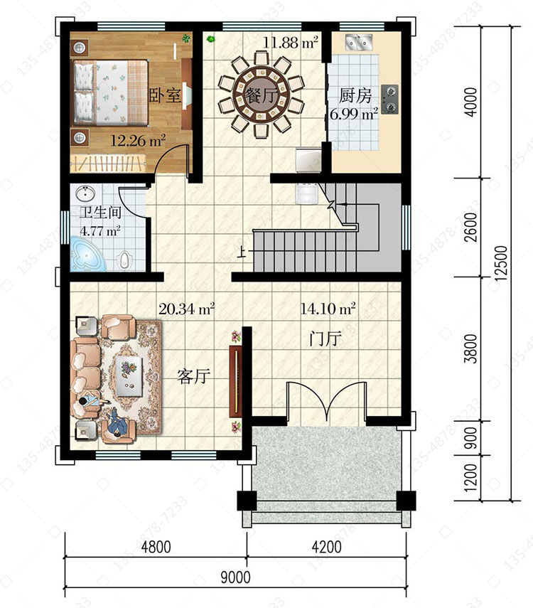 一 层:门厅、客厅、卧室、厨房、餐厅、卫生间