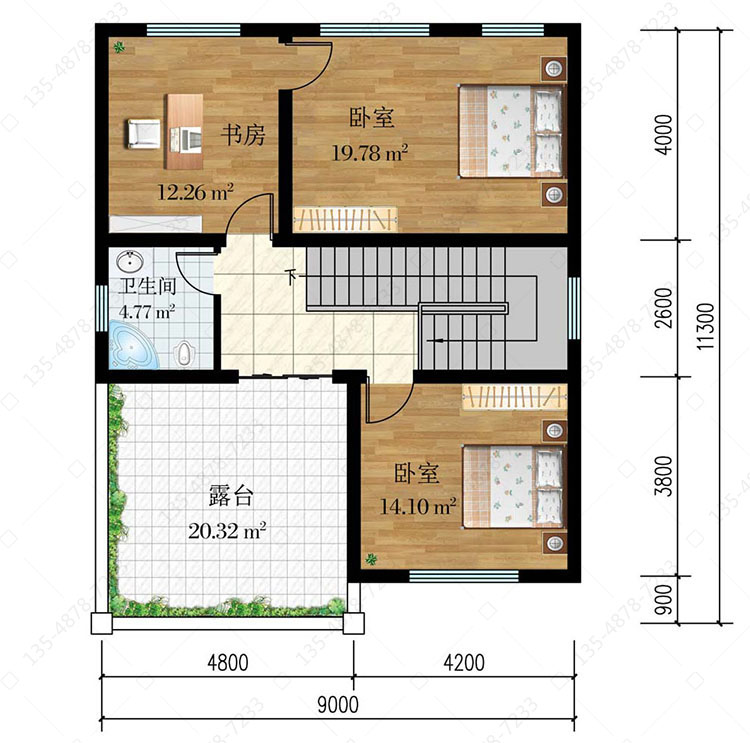 三 层:卧室(附书房)、卧室、卫生间、露台