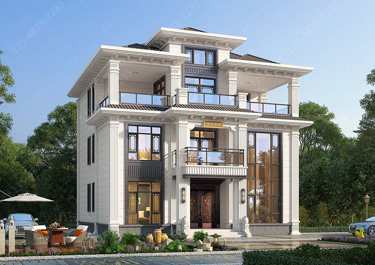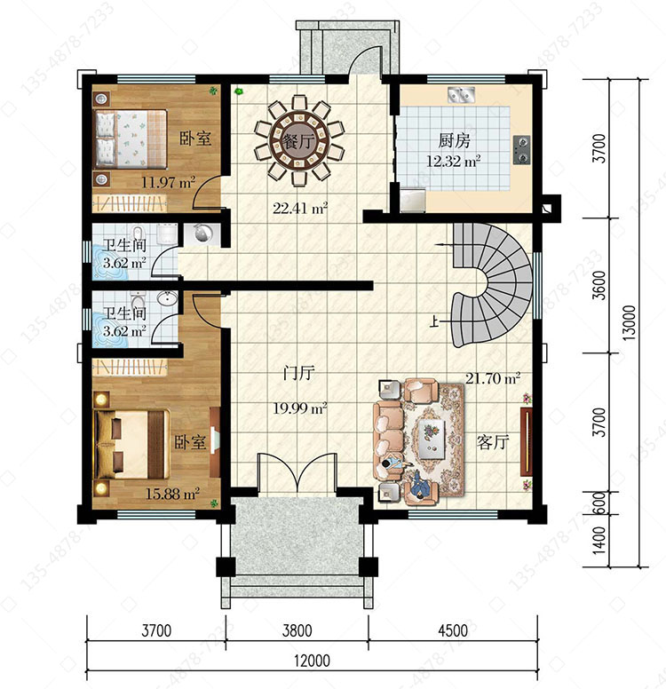一 层:门厅、客厅(中空)、卧室(附卫生间)、卧室、厨房、餐厅、卫生间