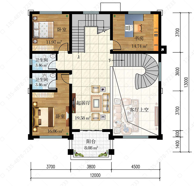 二 层:起居厅、卧室(附卫生间)、卧室、书房、卫生间、阳台