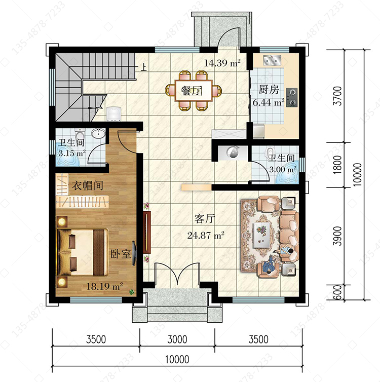 一 层:客厅、卧室(附衣帽间、卫生间)、厨房、餐厅、卫生间