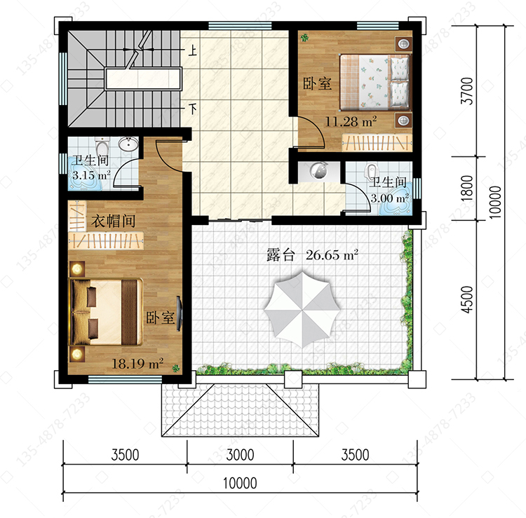 三 层:卧室(附衣帽间、卫生间)、卧室、卫生间、露台