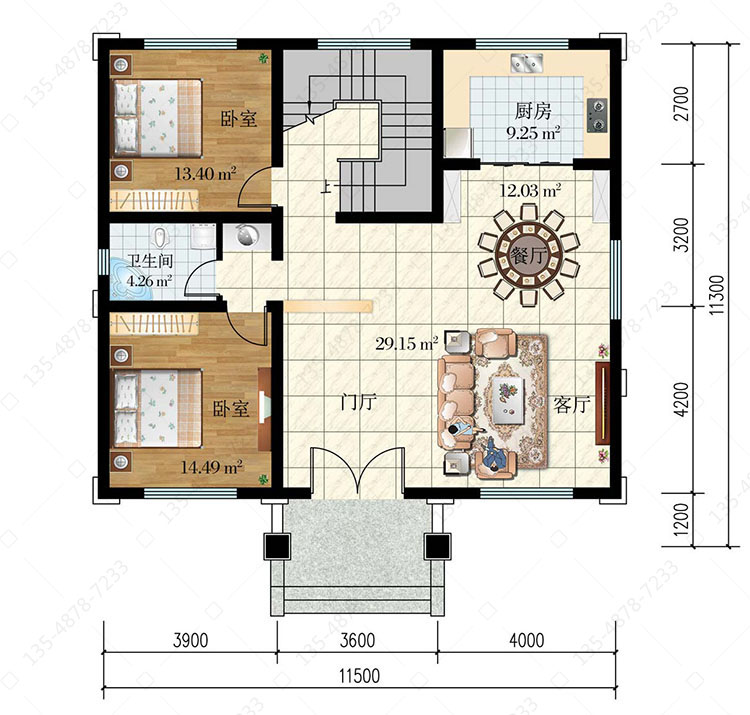 一 层:门厅、客厅、2卧室、厨房、餐厅、卫生间