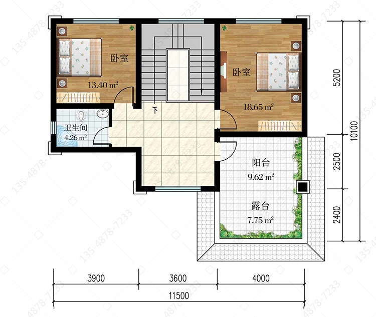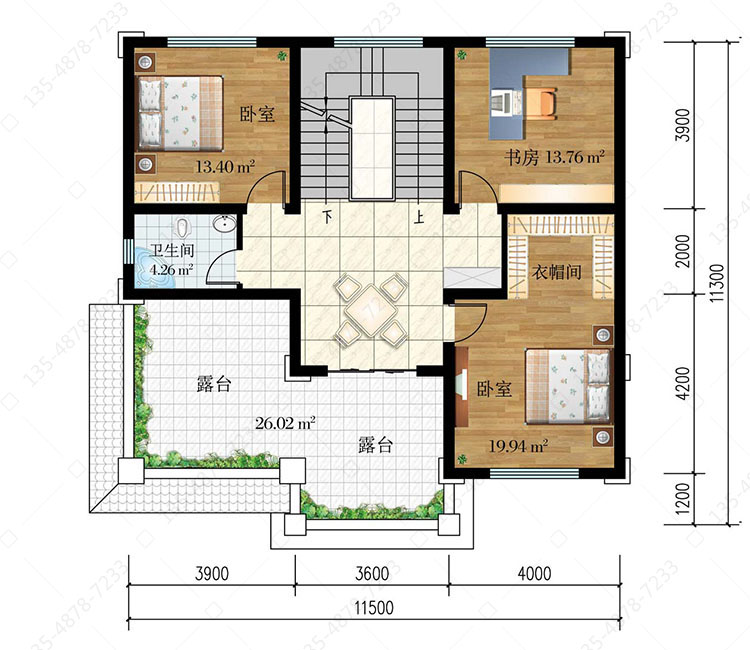 二 层:卧室(附衣帽间)、卧室、书房、卫生间、露台